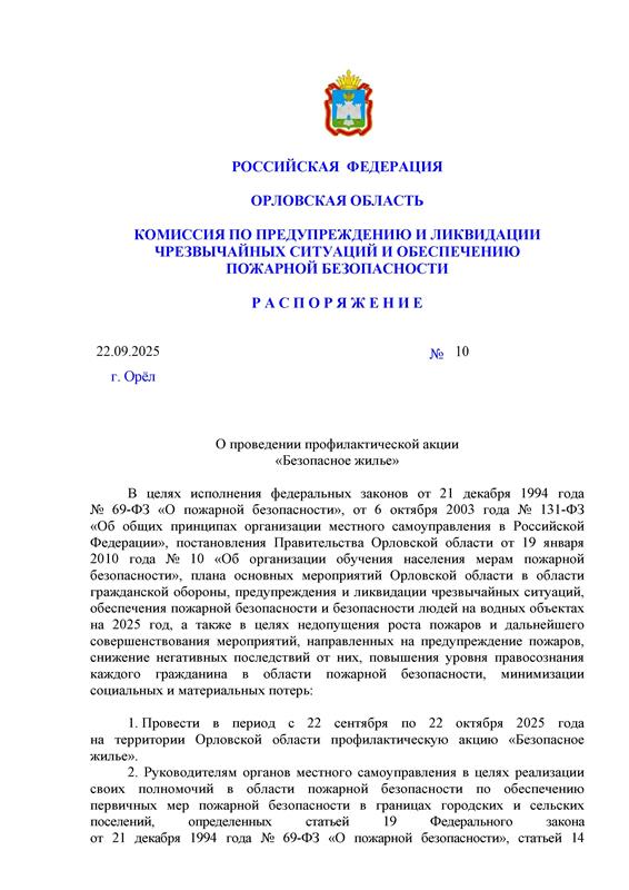 Распоряжение КЧС и ОПБ от 22.09.2025 №10 "О проведении профилактической акции «Безопасное жилье»"