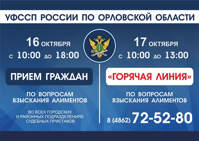 Управление Федеральной службы судебных приставов по Орловской области объявляет о проведении специальных мероприятий для оказания квалифицированной помощи населению в вопросах взыскания алиментов и защиты прав несовершеннолетних детей. С целью оказания консультативной помощи жителям региона, судебные приставы ответят на вопросы орловчан на личном приеме и по телефону "горячей линии".