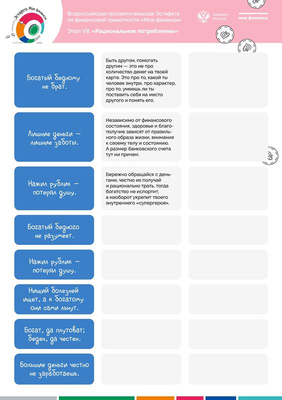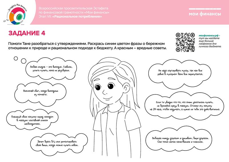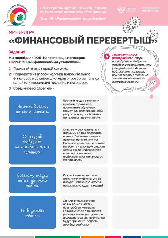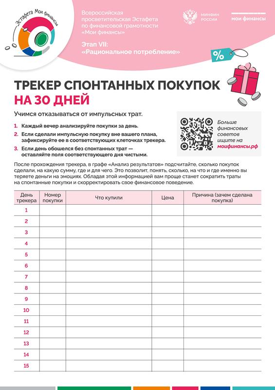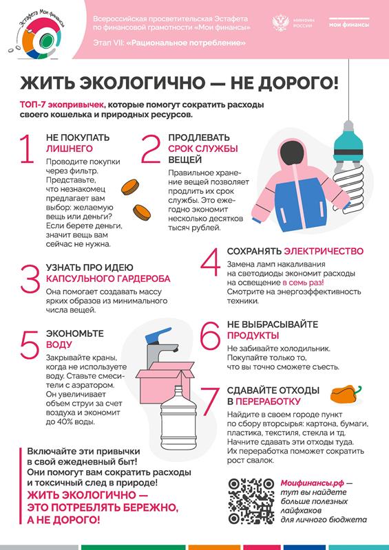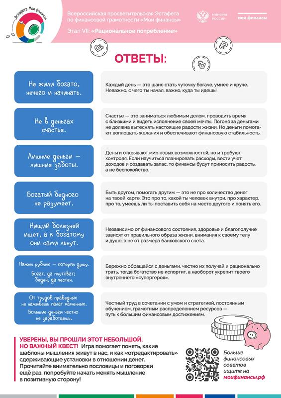 В рамках реализации Стратегии повышения финансовой грамотности и формирования финансовой культуры в Российской Федерации до 2030 года до 10 февраля 2026 года проходит седьмой этап Всероссийской просветительской эстафеты "Мои финансы" по теме «Рациональное потребление».