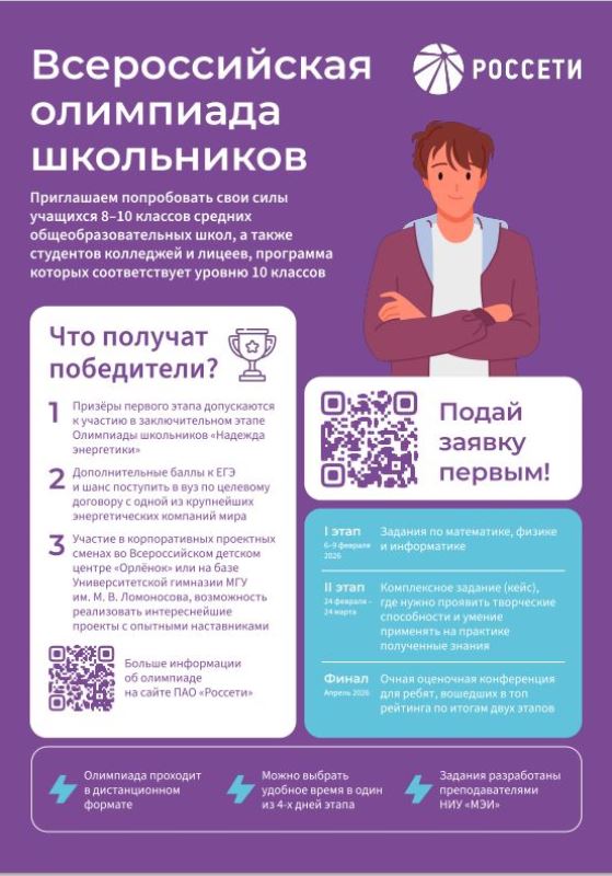 К участию приглашаются школьники 8–10 классов общеобразовательных организаций, а также студенты средних профессиональных учебных заведений. Регистрация доступна по ссылке: https://olimpiada-rosseti-2026.testograf.ru